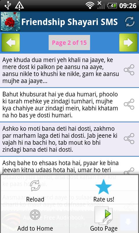 Sher-O-Shayri gives us words to express our feelings and increases inner strength too. This app is the right place for sher-o-shayris on every beautiful categories like pyar, break up dard, sad, romance / romantic love, dosti, tareef, nafrat, hindi, sms, funny jokes, patriotic, motivational, bewafai, nature, occasion based, zindagi etc.